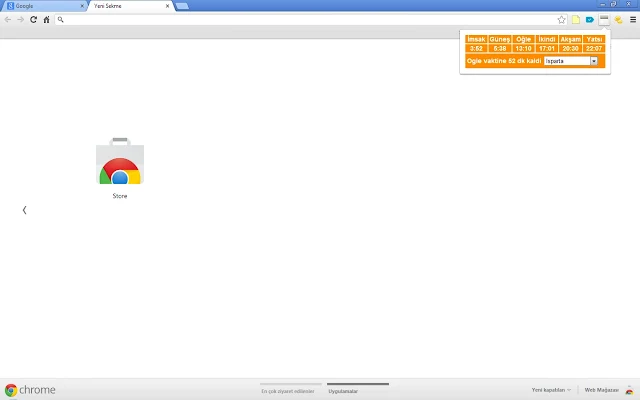 Chrome kullanıcılarının namaz vakitlerini kolay bir şekilde öğrenmeleri için geliştirdiğim uygulama. Uygulamayı çalıştırmak için sadece şehir seçimini yapmak yeterli. Bize o güne ait tüm namaz vakitlerini ve sonraki vakte ne kadar kaldığı bilgisini veriyor. Son güncelleme ile birlikte vakitleri hızlı bir şekilde görüntülenmesi sağlandı.